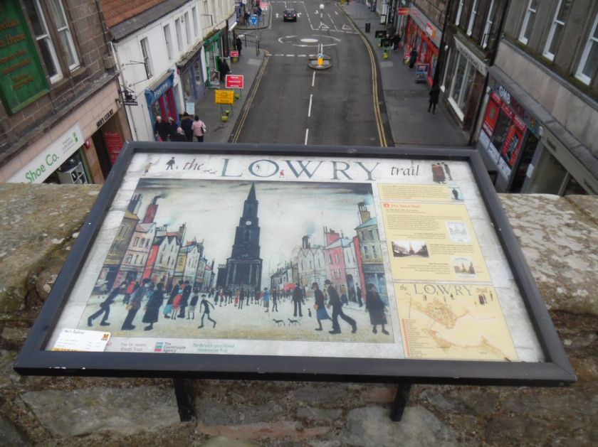 Berwick-upon-Tweed Town Hall from Castlegate depicted on Lowry trail sign.