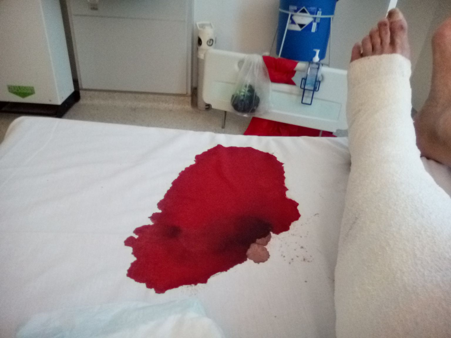 Bandaged leg and bloodstain, Royal London Hospital.