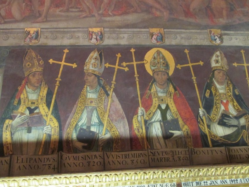 Moving down from the ceiling we have a (supply your own superlative again) frieze running round three of the four walls, the fourth wall containing a single painting behind the archbisjop’s chair. Both are the work of Luis de Medina and Alfonso Sanchez. Below the frieze are images of every prelate dating right back to St. Eugene which is like a complete record of the history of the site. I have included a couple of the most recent.