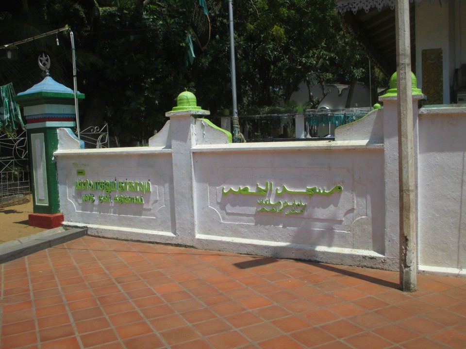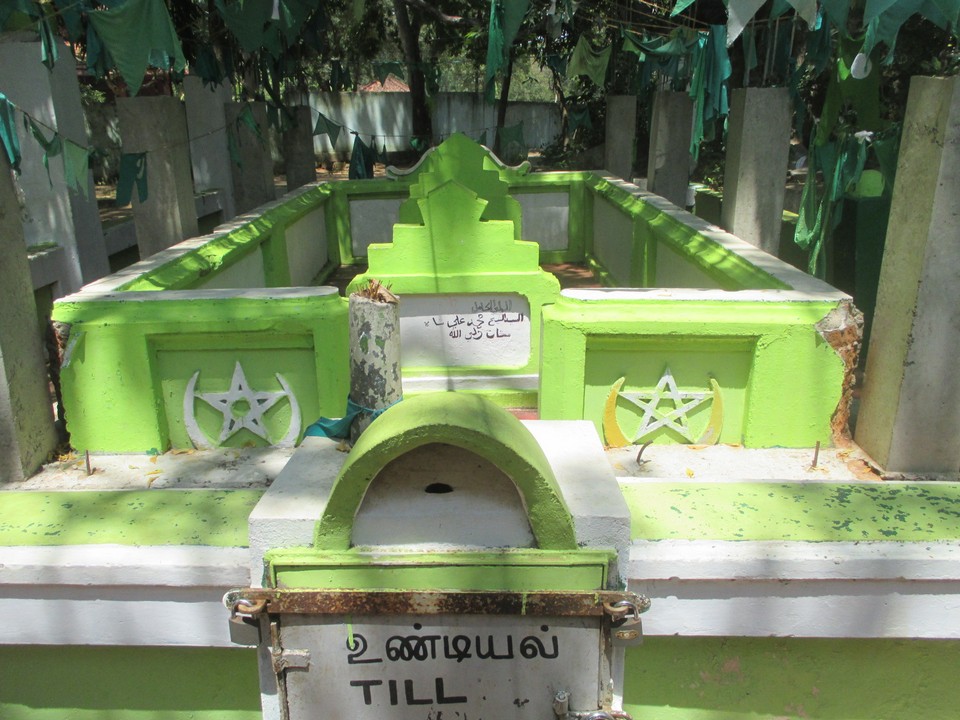 Only a matter of yards from these two kovils I saw a compound that could only have been Moslem and indeed it was. The predominance of the colour green which is the Moslem colour, the Arabic writing on the front wall and the crescent moon and star motif on the gatepost and water cistern were easy to spot.