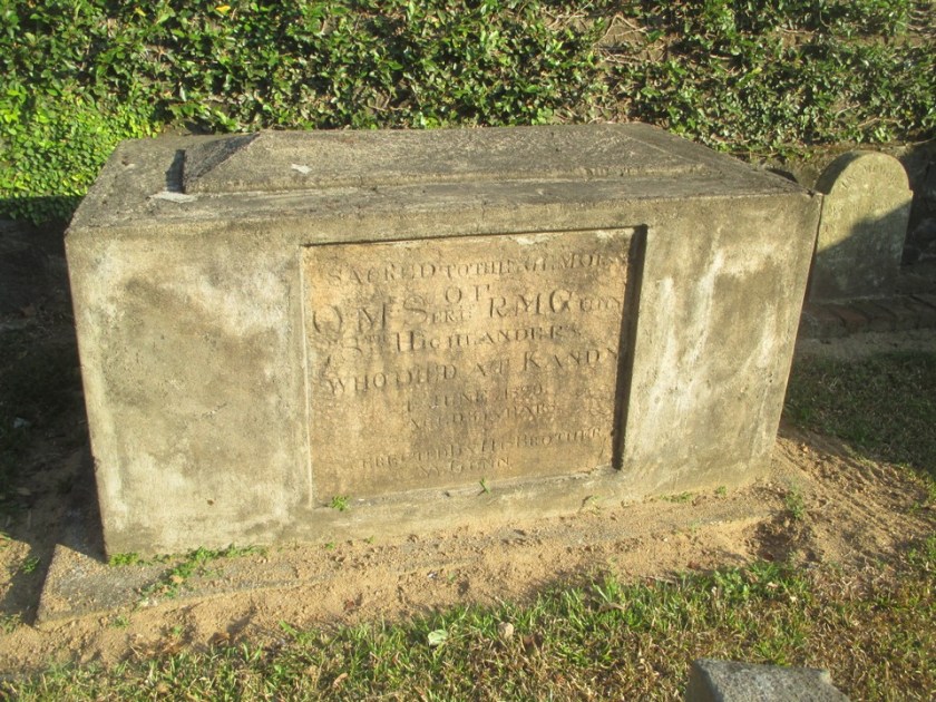 QM Sgt. Gunn, appropriate name for a soldier I thought, lies here. He served in the 78th Highland Regiment Regiment also known as the Ross-shire Buffs and I cannot help but think it is a long way from their home barracks in Inverness to Kandy. When he died in 1829 they were in the middle of a 12 year tour in Ceylon. Imagine posting a Regiment for 12 years nowadays. Every stone here tells a story.