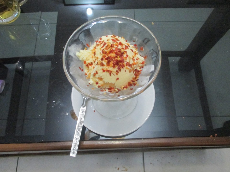 After my very tasty main, D.G asked me if I would like some ice cream for dessert and although I am not a great sweet eater I agreed and then he threw me completely by asking did I want chilli on my ice cream? What? I have eaten a lot of dishes in a lot of places but this was a new one on me. In all my travels in Asia where chilli is King I had never heard of this before but I like chilli so why not? I kid you not, it is gorgeous.