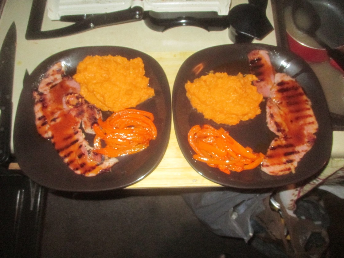 We got back fairly late and it was back into the galley again as we hadn’t eaten that evening. It was obviously a leisurely affair as my images show that the starter went “to the pass” at 2311 and the main showed up at 0158. Oh dear. Chef’s Special that night was Nova Scotian line-caught, home smoked mackerel with a duo of salads followed by griddled gammon steaks served with roast peppers and sweet potato mash. It sounds posh in restaurant language but, as you can see, it was fairly basic.