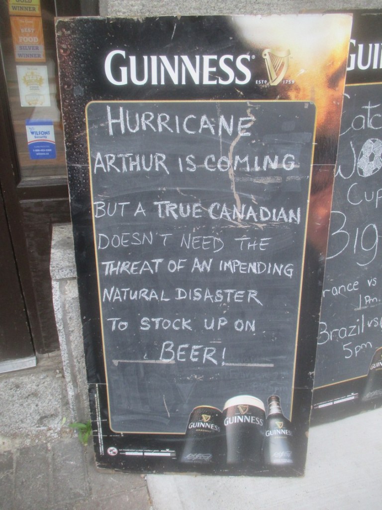 No, everything was fine. I was in Betsy with Lynne with no obvious injuries and my wallet intact and eventually we both got up. Some time thereafter we received a visit from one of the lovely campground staff asking us if we would mind terribly moving to another pitch as there was a hurricane coming! What? It is not exactly the kind of thing you hear every day but it wasn’t some sort of practical joke and Hurricane Arthur was indeed heading right for us.