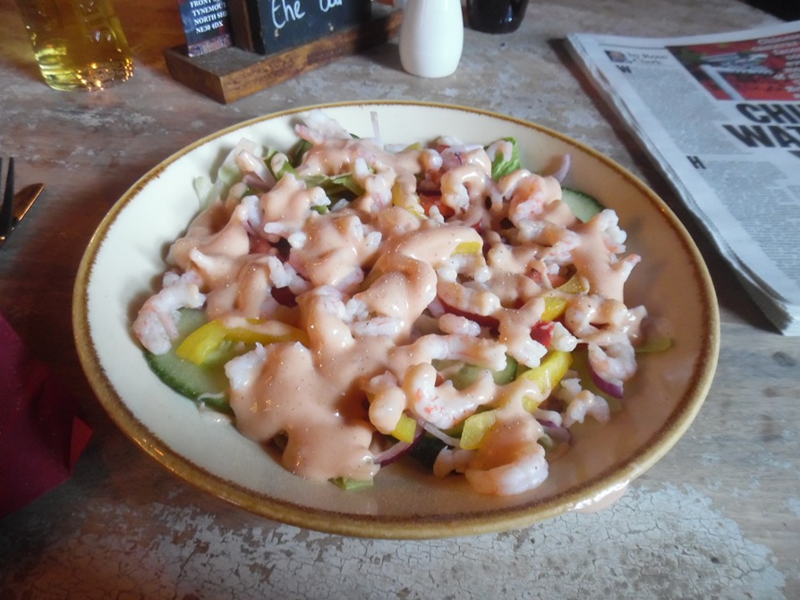 The image above shows what was served to me, and it was not expensive AND was what could easily have done duty as a main course. I am quite sure the appalling concept of “nouvelle cuisine”, which I detest, never made it to Tyneside, the Geordies would not have stood for it. I had a full plate of mixed leaves and yellow peppers, an unbelievable portion of prawns for a starter, served with a very decent Marie Rose and I took one look at it and wondered how I was going to finish it. Strangely enough for me, it was so tasty I downed the lot.